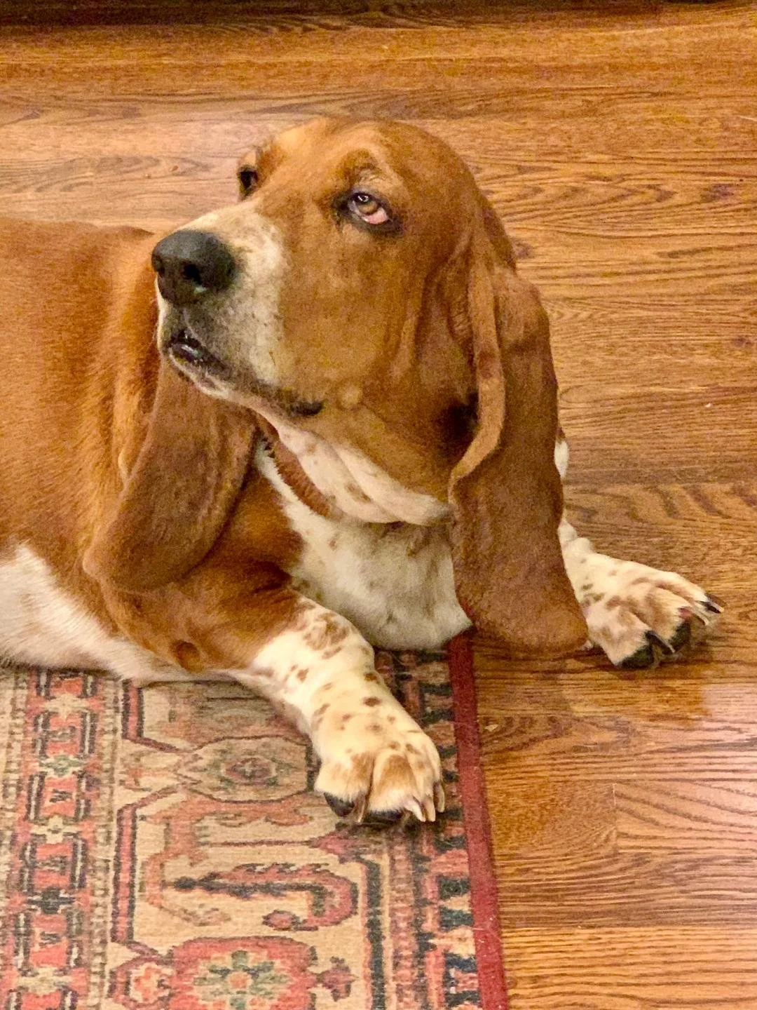 Sybil was our first basset in this crazy adventure. She has had three litters for us and is now supervising her grandchildren here on the farm. You don’t mess with Sybil! She is ALWAYS “talking” to us.